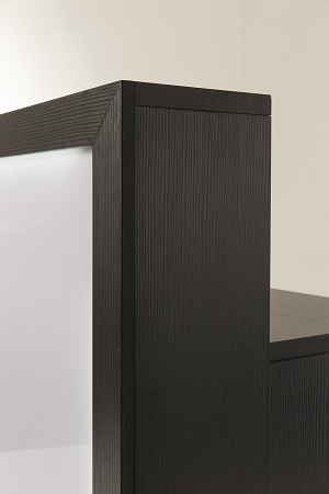 Receptiemeubel in fineerhout met verlichte voorkant. Beschermplaat onderaan in 304 roestvrij staal. 2 lades met sleutel en ladestop. 2 deurtjes. Uitschuifbare plaat voor computertoetsenbord. 3 mandjes aan de achterkant. 4 kabelgoten.
