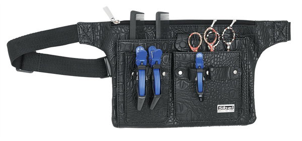 Holster in echt leer voor 3 scharen + vakken voor kammen en ander materiaal. Extra horizontaal vak met ritssluiting