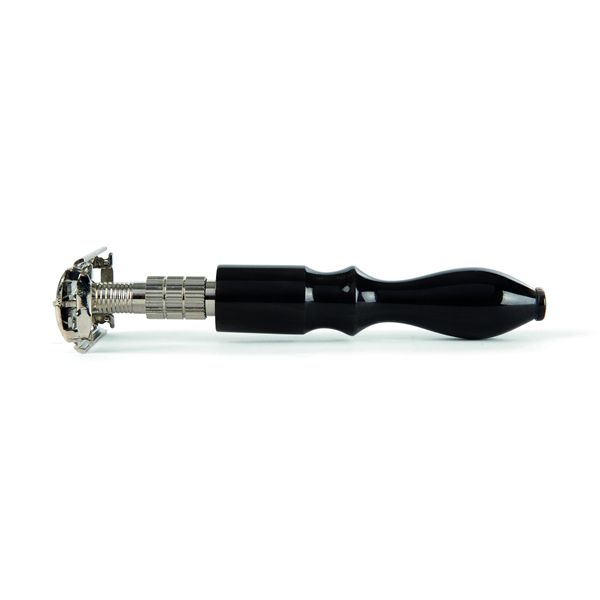 Veiligheidsscheermes met vlindersluiting. Vintage design, ligt uitstekend in de hand dankzij het hoge gewicht. Wordt gebruikt met dubbele scheermesjes voor een traditionele scheerbeurt.