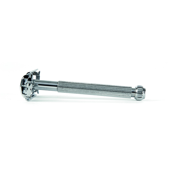 Veiligheidsscheermes met vlindersluiting. Vintage design, ligt uitstekend in de hand dankzij het hoge gewicht. Wordt gebruikt met dubbele scheermesjes voor een traditionele scheerbeurt.