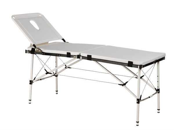 Zeer licht maar stabiel massagebed in aluminium. Regelbare rugleuning met gezichtsgedeelte. In de hoogte verstelbaar (66-86cm). Inclusief opblaasbaar kussentje en beschermhoes.