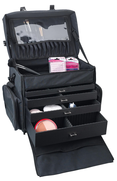 Mooie zwarte nylon beauty tas met schouderriem. Meerdere uitschuifbare opbergvakjes en make up borstel vak bovenaan.